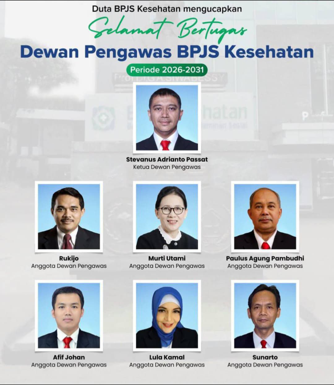 Berikut Daftar Anggota Dewan Pengawas BPJS Kesehatan 2026—2031: Prof Dr Dr Stevanus Adrianto Passat Mkk C Med dari Unsur Pekerja (sebagai Ketua) Murti Utami Andyanto dari Unsur Pemerintah (sebagai Anggota) Rukijo dari Unsur Pemerintah (sebagai Anggota) Afif Johan dari Unsur Pekerja (sebagai Anggota) Paulus Agung Pambudhi dari Unsur Pemberi Kerja (sebagai Anggota) Sunarto dari Unsur Pemberi Kerja (sebagai Anggota) Lula Kamal dari Unsur Tokoh Masyarakat (sebagai Anggota)
