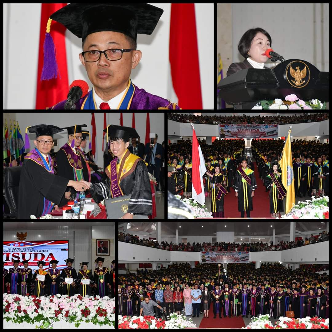 Rektor Universitas Sam Ratulangi Prof. Dr. Ir. Oktovian Berty Alexander Sompie M.Eng. IPU. ASEAN Eng dalam sambutannya mengatakan, prosesi wisuda adalah bukti nyata keberhasilan dalam sebuah perjuangan. “Kalian semua, 1203 wisudawan, adalah bukti nyata bahwa dengan tekad yang kuat, dan doa yang tulus segala tantangan dapat diatasi,” ujar Rektor.