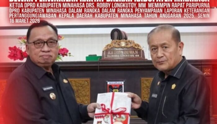 Minahasa,jejakperintis.com – Rapat Paripurna DPRD Minahasa dihadiri Bupati Minahasa Dr. Robby Dondokambey SSi, MAP, bersama Wakil Bupati Vanda Sarundajang SS, diketahui Rapat Paripurna DPRD Minahasa dalam rangka penyampaian Laporan Keterangan Pertanggungjawaban (LKPJ) Kepala Daerah Tahun Anggaran 2025, berlangsung di ruang sidang Kantor DPRD Minahasa, Senin (16/3/2026).
