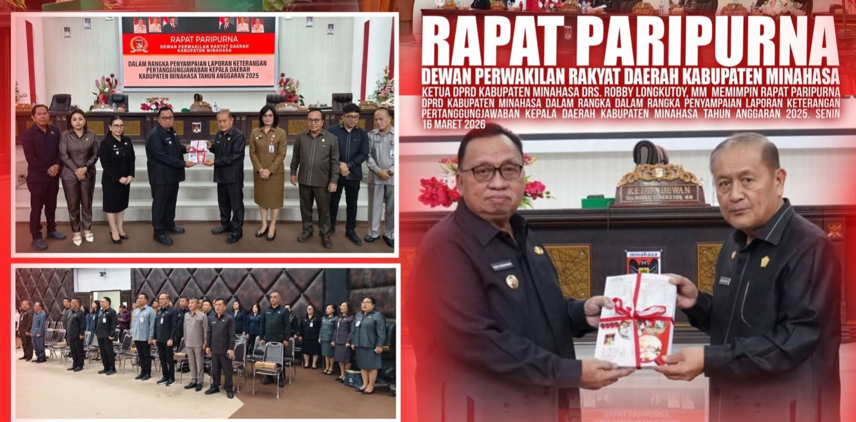 Minahasa,jejakperintis.com – Rapat Paripurna DPRD Minahasa dihadiri Bupati Minahasa Dr. Robby Dondokambey SSi, MAP, bersama Wakil Bupati Vanda Sarundajang SS, diketahui Rapat Paripurna DPRD Minahasa dalam rangka penyampaian Laporan Keterangan Pertanggungjawaban (LKPJ) Kepala Daerah Tahun Anggaran 2025, berlangsung di ruang sidang Kantor DPRD Minahasa, Senin (16/3/2026).