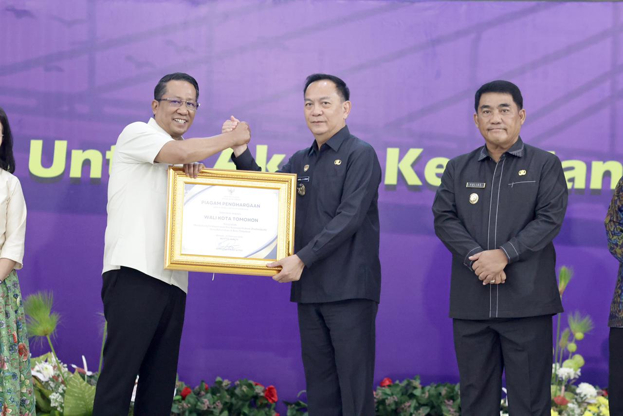 Jejakperintis.com – Wali Kota Tomohon, Caroll J. A. Senduk, menerima piagam penghargaan dari Supratman Andi Agtas, Menteri Hukum Republik Indonesia, atas dukungannya dalam pembentukan Pos Bantuan Hukum (Posbankum) di tingkat desa dan kelurahan.