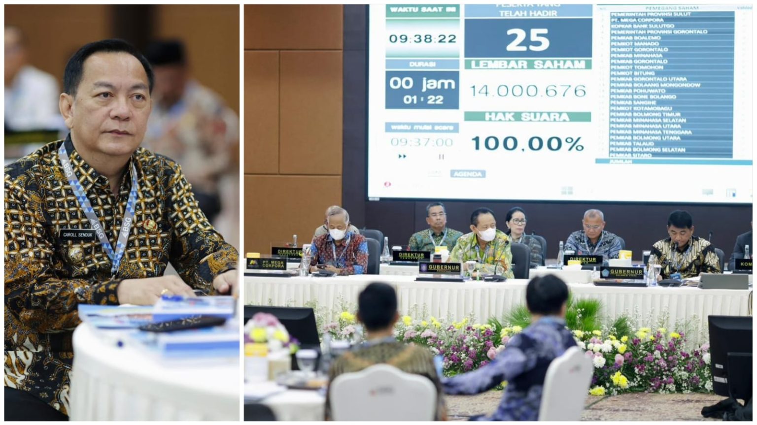 RUPS turut dihadiri Gubernur Sulawesi Utara selaku Pemegang Saham Pengendali, Gubernur Gorontalo, perwakilan PT Mega Corpora, serta para bupati dan wali kota se-Sulawesi Utara dan Gorontalo. Agenda ini juga menetapkan sejumlah keputusan penting terkait arah kebijakan perusahaan, termasuk penguatan struktur manajemen guna mendukung kinerja bank ke depan.