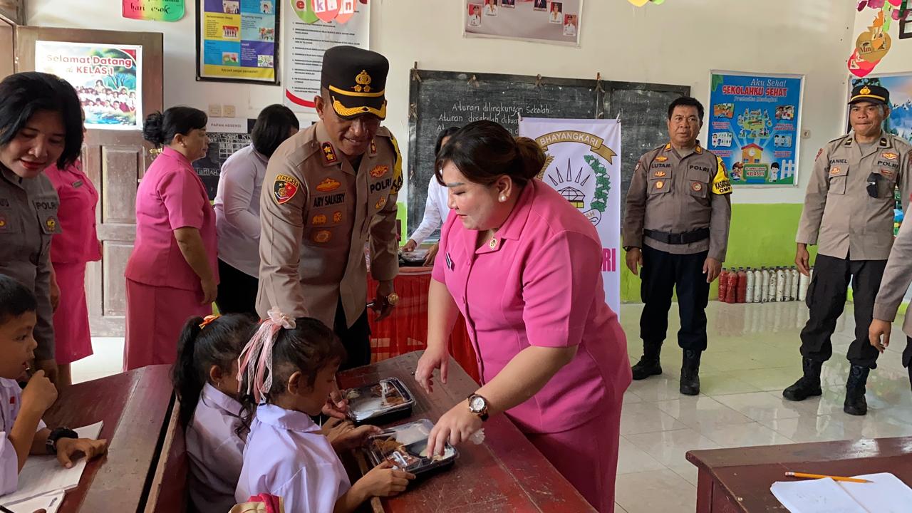 Bagikan Makan siang Gratis untuk anak SD, Kapolres Minsel didampingi ketua Bhayangkari Minsel.